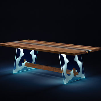 La lastra di vetro centrale è sostenuta da due tavole in legno massiccio con effetto corteccia nel bordo